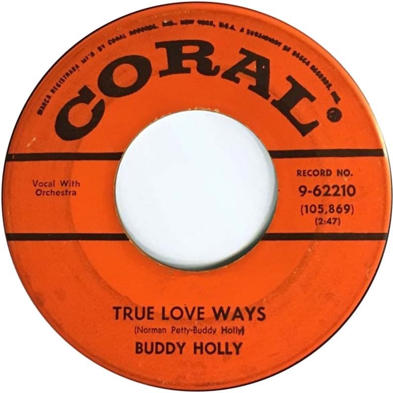 “True Love Ways” was recorded at Buddy Holly’s last recording session on October 21, 1958, less than four months before his death. The session took place at Decca’s Pythian Temple studio and included two other great Holly Songs: “It Doesn’t Matter Anymore” and “Raining in My Heart.” This studio session seems to indicate Holly’s transitioning from upbeat rock ‘n’ roll toward more melodious, slower tempo, orchestral arrangements. “True Love Ways” was not released until March 1960 on a posthumous album The Buddy Holly Story, Vol. 2.